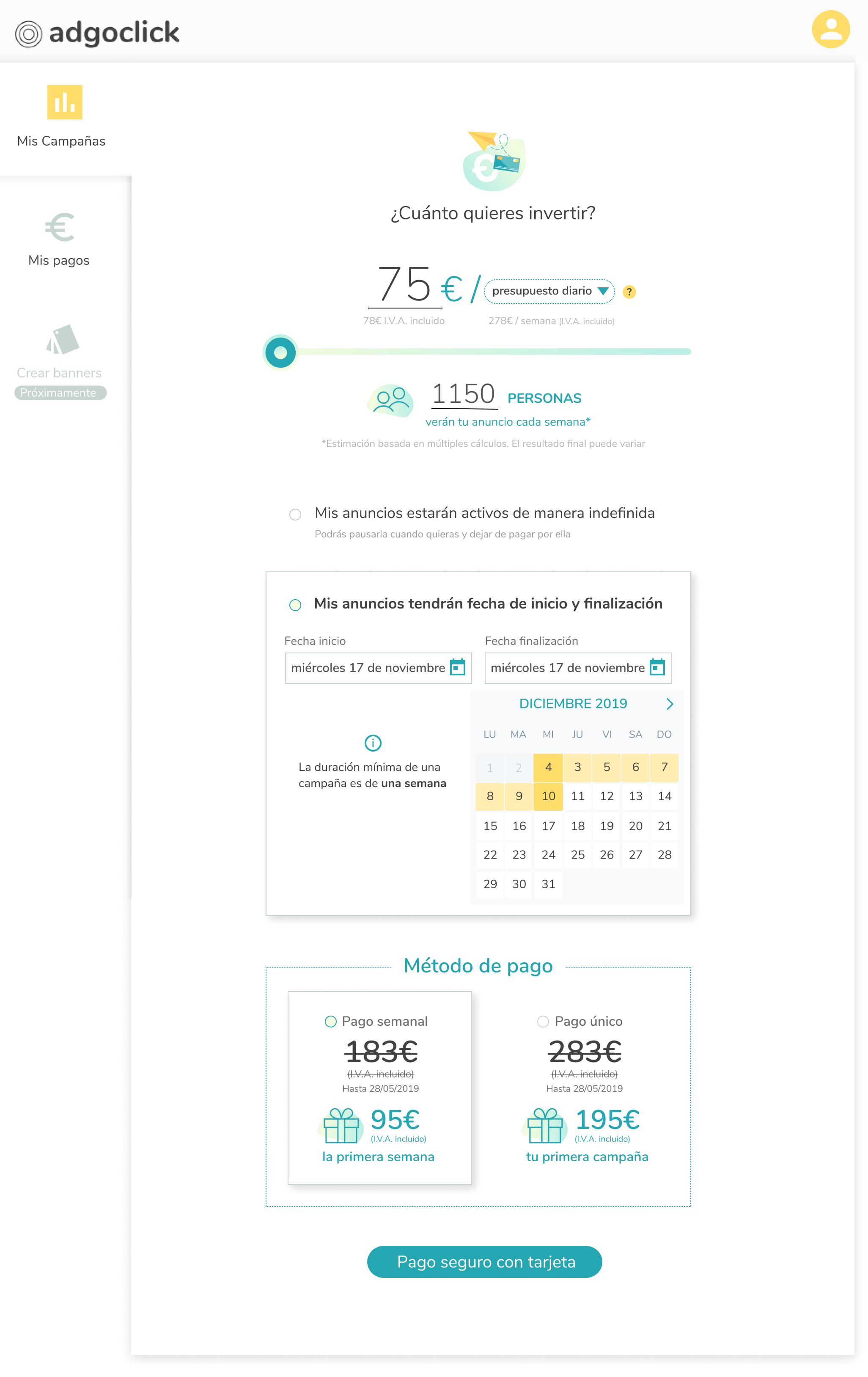 Campaign Ads Budget Settings. Breaking the campaign in 3 main requirements: budget, campaign period; payment for the allocated budget. An engaging feature has been added for the budget section to simulate the impact of the budget spent to give users an imformed estimate of the reach of the campaign being created.